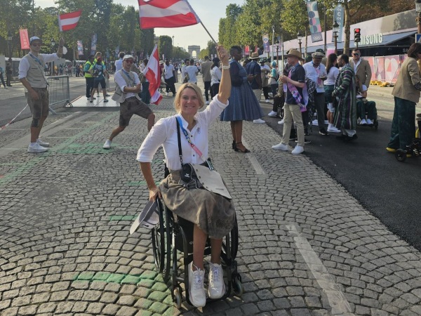 Das Paralympic Team Austria wurde beim Einmarsch der Nationen von Para-Badminton-Spielerin Henriett Koosz und Para-Dressurreiter Pepo Puch angeführt, die mit der österreichischen Fahne an der Spitze rollten und marschierten.