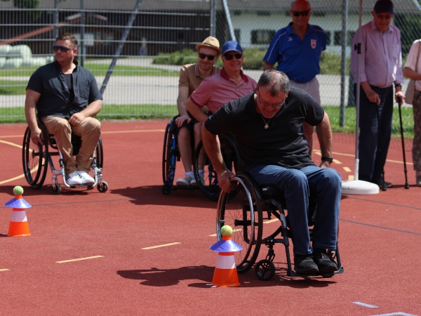 Alle 2er Teams wurden wiederum einer Gruppe zugeordnet in der man gemeinsam alle Stationen besuchte. So ging es heuer sehr bunt zu, da jede Gruppe mit farbenfrohen Gasluftballons gekennzeichnet war, die sich lustig über das ganze Areal bewegten. Ein Novum des heurigen Sportfestes war die Wettfahrt am Ende des Festes. Aus jeder Gruppe wurden 4 Personen ausgewählt die gemeinsam im Rollstuhl ein spannendes Staffelrennen auf der Innenhofrunde absolvierten.