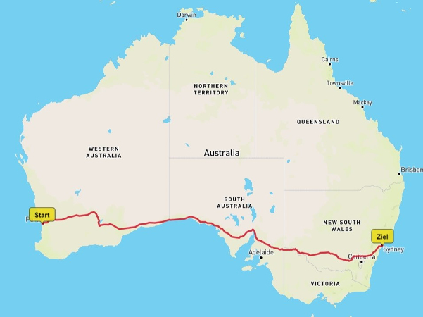 Sobald wir Perth und seine Vorörtchen hinter uns gelassen haben führt die Strecke geradewegs Richtung Osten, wo uns auf 3900km Strecke quer durchs australische Outback extreme Temperaturunterschiede, mögliche Känguruhattacken, Roadtrains mit über 40 Tonnen sowie die längsten Geradeausstrecke des Kontinents (146 km) erwarten.