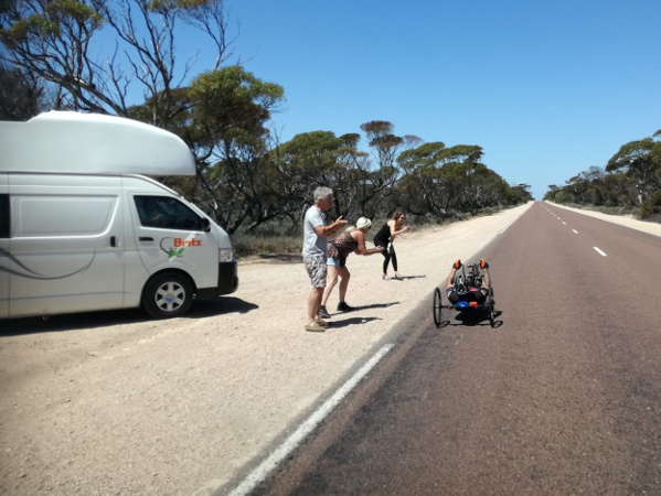 Wir konnten West Australien hinter uns lassen und sind jetzt in Süd Australien. Es erstaunt uns immer noch wie die Zeit vergeht und wie schnell sich eine gewisse Routine eingestellt hat. Die Wechsel klappen reibungslos, Landschaften ziehen vorbei, Shakes werden zubereitet, Daten eingelesen, man wechselt sich zum Schlafen ab. Die Menschen begegnen uns nach wie vor extrem freundlich und interessiert. Wenn wir von unserem Vorhaben berichten, dann hört man meist „ This is crazy“. In der Nacht halten immer wieder Fahrzeuge (auch Road Trains) an und fragen, ob alles ok ist oder ob wir Hilfe brauchen.